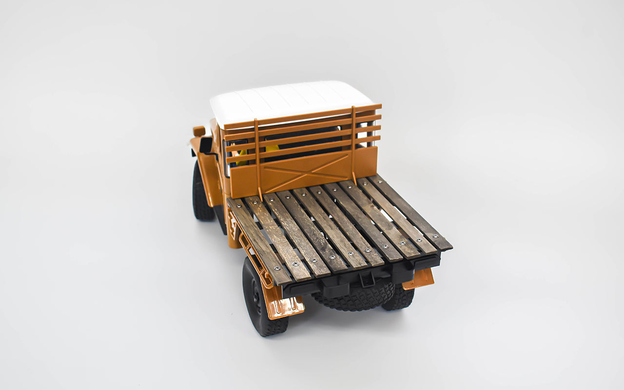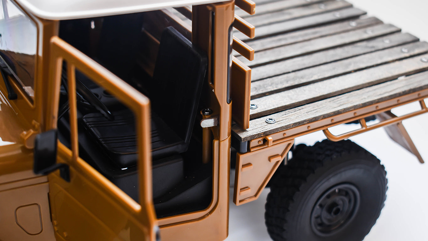 荷台の板はなんと木製、実車ライクなフラットベッド仕様、サイドにはロープやフックを掛けるためのステーも再現されているから簡単な工夫で荷物を固定することもできます。お気に入りのアイテムを積んで雰囲気アップ!