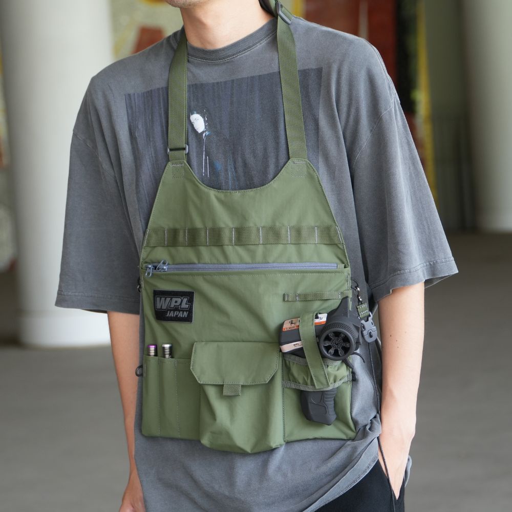 エプロン型とドローストリングの斜め掛け型を楽しめる。
