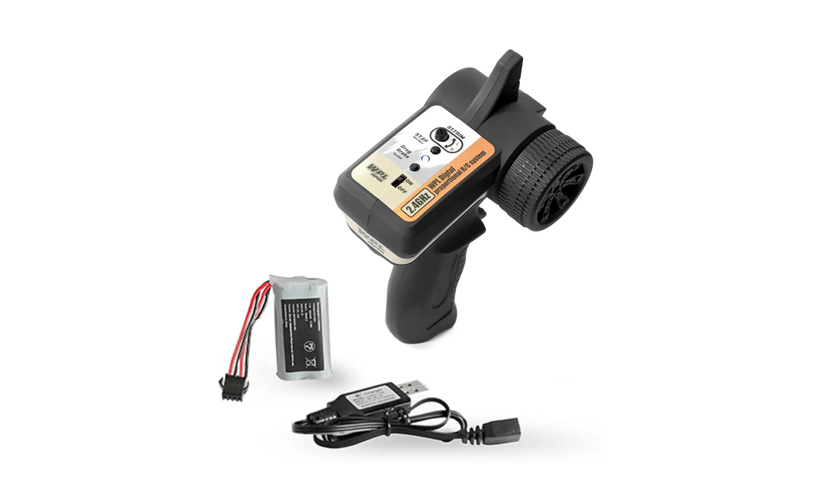 組み立て済みの本体、送信機(プロポ)、バッテリー、USB充電器が入ったフルセット。