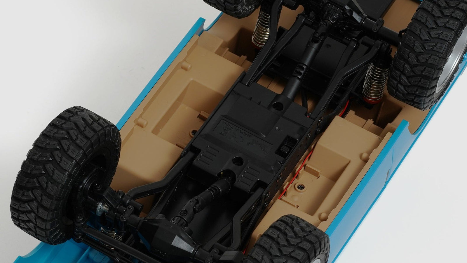 1/12スケールながら本格的なクローラーモデルと同様のラダーフレーム+前後4リンク式サスペンションを採用、さらにステアリングサーボもアクスルマウント方式とすることでデザイン性だけでなく、頼もしい相棒として本格的な悪路の走行も楽しめます。 4リンクサスの広い可動域をオイルダンパーで支持することでしなやかな足の動きと衝撃吸収性能を確保しつつ、堅牢なラダーフレームと相まってきっと色んな難所であなたの期待に応えてくれます。